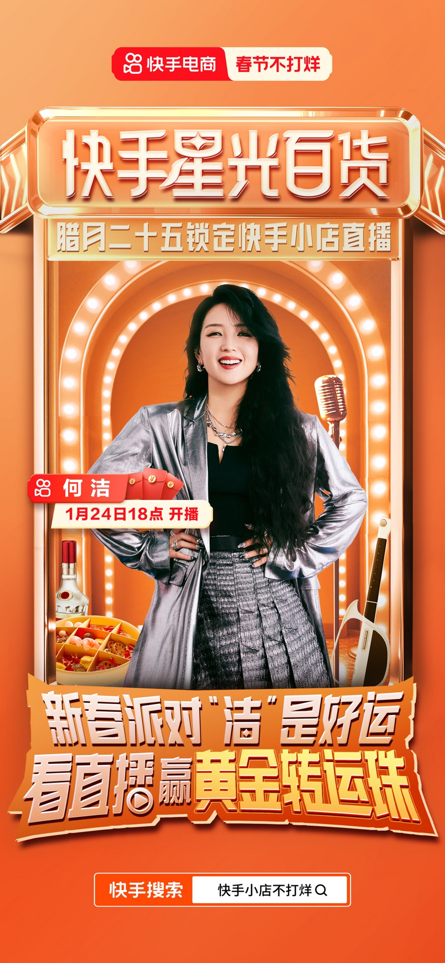 1月24日,快手星光百货系列活动将上线首场直播,著名歌手何洁将率先走进快手直播间,带来主题为“新春派对 「洁」是好运”的专场直播,邀请快手老铁们参加一场年末的云派对,组成一场火锅局,聊聊全国各地特色美食,分享新年送礼攻略。