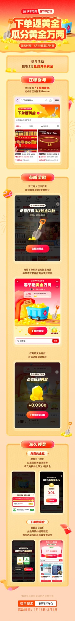 2025年春节期间,快手电商以“年味无时差,48小时极速发”为主题,打造“春节不打烊”电商会场,为用户提供48小时发货的物流保障,并上线「下单返黄金」趣味玩法,用户在快手商城下单CNY相关商品,每单均可获得挖黄金次数奖励。活动期间积累的黄金克数,可用于兑换等额的黄金消费券,或等额的提现额度。