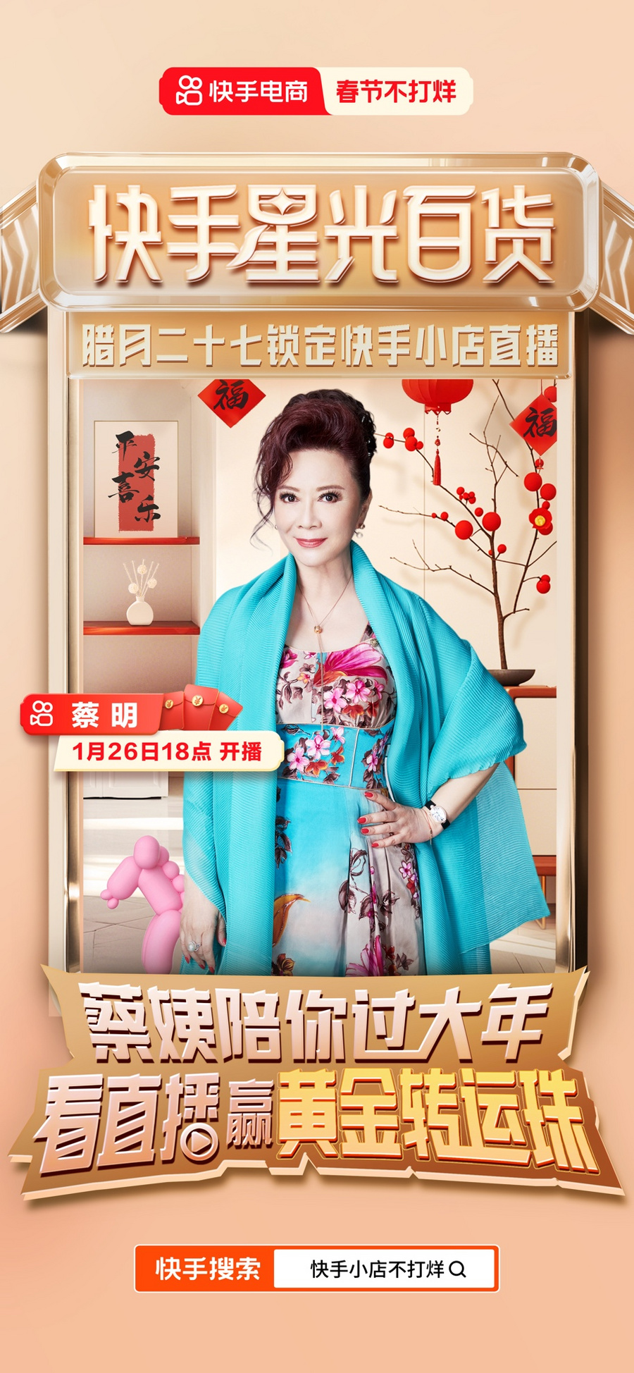 1月26日,著名演员蔡明将接棒走进直播间,带来主题为“蔡姨陪你过大年”的专场直播。在春晚陪伴了观众28年的蔡明老师,在这个春节,将在快手小店直播间和观众团聚,为大家送上新春祝福的同时,分享自己“开盲盒式”的独特人生观与生活经验,将快乐带给大家。